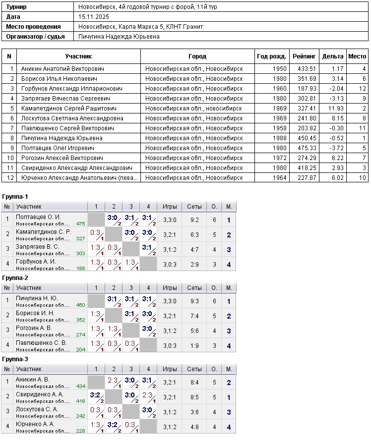 15.11.2025 г., 4й годовой турнир с форой, 11й тур